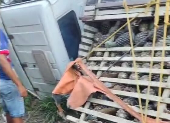 Um caminhão que transportava uma carga de abacaxi tombou nesta quarta-feira (10) em Novolândia. Apesar do susto, segundo informações, não…